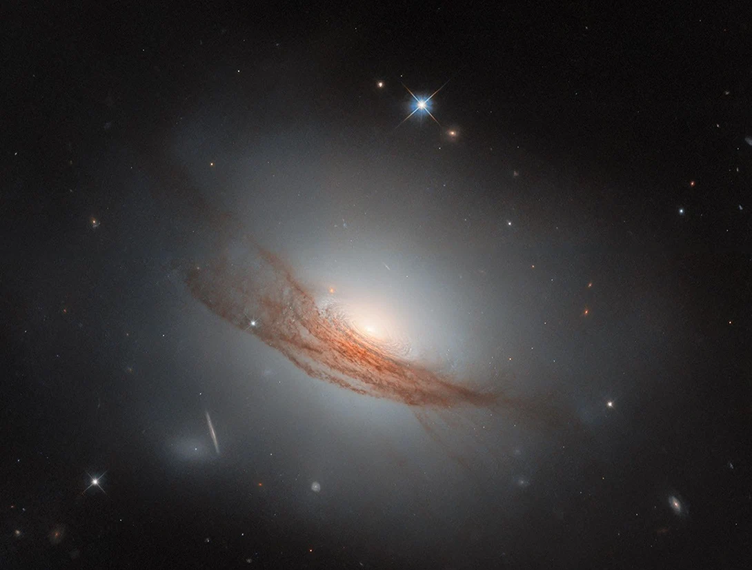 La característica que más llama la atención de la misma son las largas franjas de polvo en tonos rojizos que envuelven al disco exterior y a su halo, cuyo origen podría estar en la fusión con otra galaxia en el pasado.