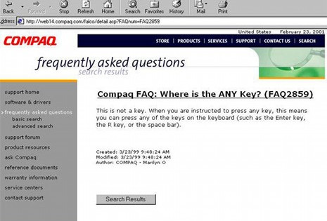 Surrealista o no, durante varios años Compaq dedicó un apartado de su FAQ a explicar a sus usuarios qué es lo que quieren decir exactamente los fabricantes de software cuando, al instalar un programa, nos indican que podemos presionar «cualquier tecla». Aquí tenéis la captura realizada a la página en cuestión: