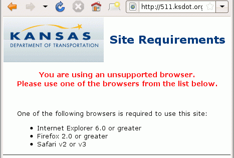 Parece mentira, pero todavía hay páginas que vetan la entrada a aquellos internautas que no utilizan unos determinados sistemas operativos y navegadores. Es el caso de esta web del Kansas Department of Transportation, un organismo que se encarga del mantenimiento de las carreteras públicas del estado estadounidense.