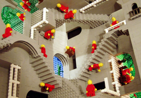 Hoy vuelvo a traerlo a la portada del blog puesto que, a través del artículo Fantastic Plastic: 20 Essential Works of LEGO Art, he llegado a la página personal de Andrew Lipson, un tipo que se define a sí mismo como un empollón profesional y que durante los últimos años ha ido representando con bloques de Lego algunas de las obras más conocidas de Escher, como es el caso de Relativity, Belvedere, Ascending and Descending o Waterfall.