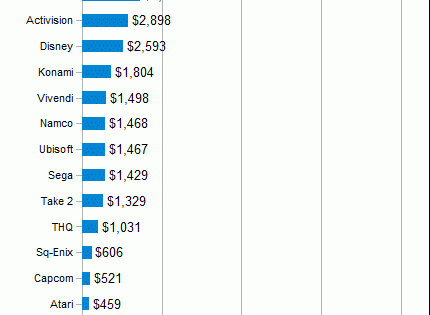 La primera gráfica que os paso a mostrar hace referencia a los ingresos conseguidos en este último ejercicio. La tabla está encabezada, cómo no, por Nintendo, Sony, Microsoft, EA y Activision, los grandes gigantes del mundillo: