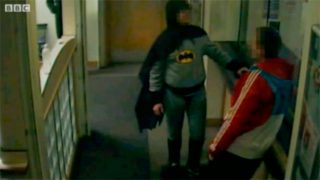 Un hombre vestido de Batman apresa a un delincuente y lo entrega a la policía